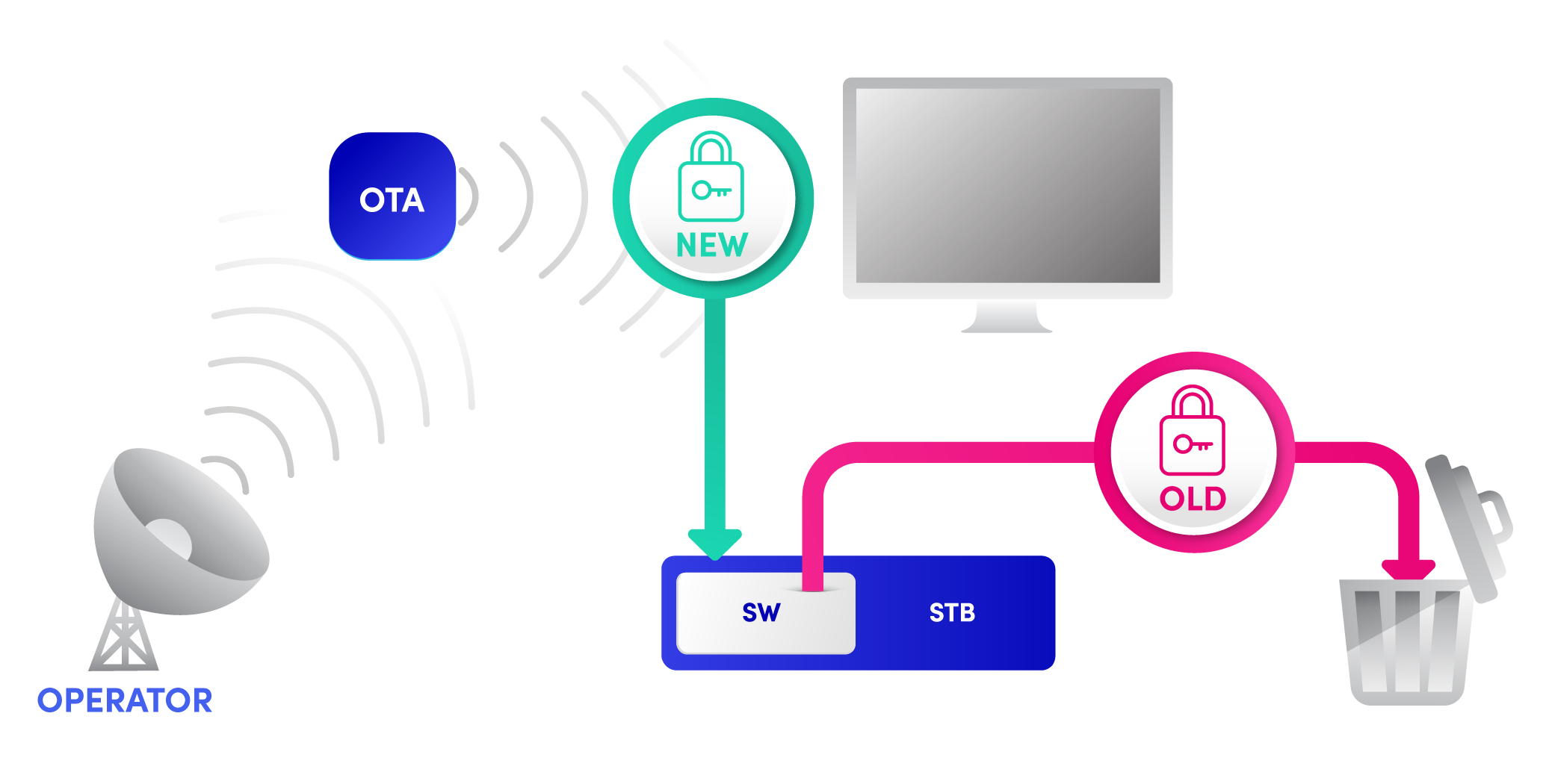 Ces technologies permettent une migration sécurisée du système d'accès conditionnel par voie hertzienne. Les mises à jour OTA sont transmises par satellite aux décodeurs déployés, ce qui permet un fonctionnement simulcrypt avec l'ancien système d'accès conditionnel. Une fois que le déploiement atteint une masse critique, l'ancien système d'accès conditionnel peut être entièrement retiré en quelques semaines.